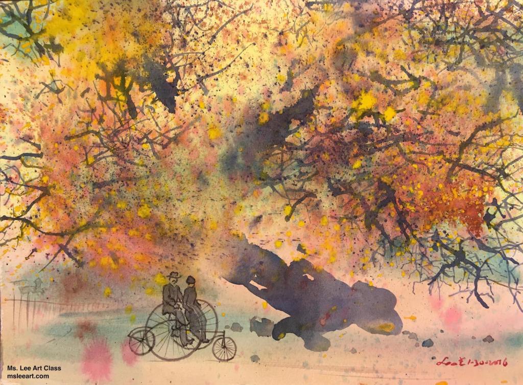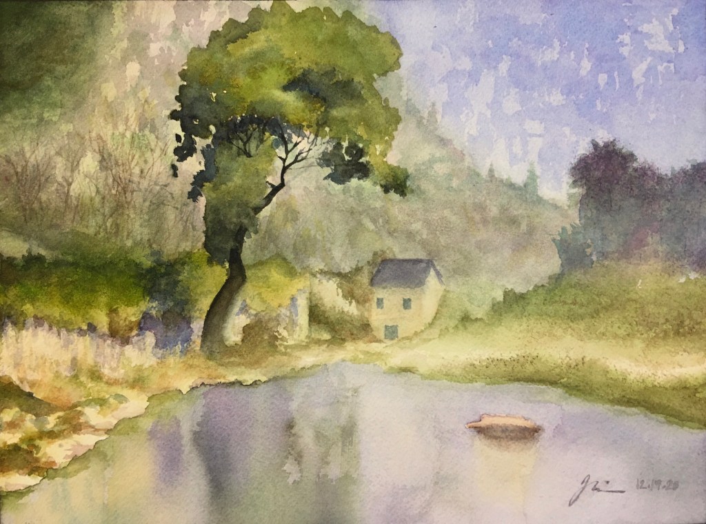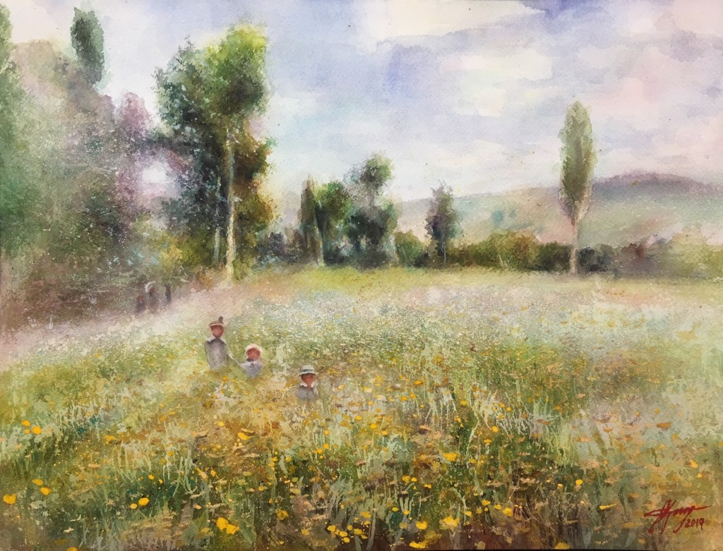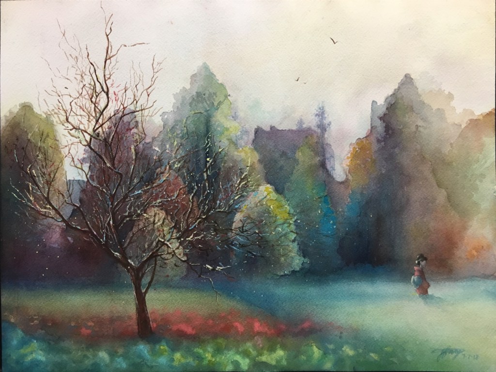 Of all the watercolor works in this gallery, a similar phenomenon is shared by the charcoal works in Gallery 1 and is marvelously displayed across the board; that is, while students use the same reference picture in the curriculum and apply the same aesthetic principles learned in the class, their work, however, amazingly manifests divergent beauty, creativity, and skills for the same subject matter. This is the unequivocal impact of what the instructions and inspirations tailored for each student promote: personal variations in expression, literary content enrichment, musicality in paintings, rhythmic arrangements, sense of movement, and improvisational performance in any given medium, in this case watercolor. Their work collectively shows that they are well-equipped, not only to cope with their own particular difficulties that occur in the painting process, but also to master this art medium confidently and gradually. All the resources and help from this studio have rendered each piece unique, independent, complete, and lively, showing innovative variations.